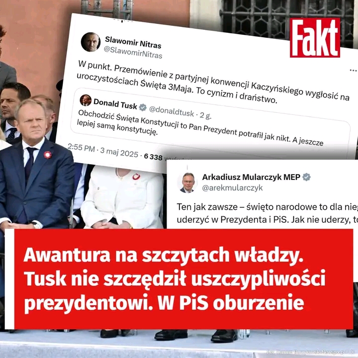 Jeden komentarz Donalda Tuska wywołał polityczną burzę w mediach społecznościowych. Premier w Święto Konstytucji 3 Maja zwrócił się do Andrzeja Dudy i przypomniał głowie państwa, że w ciągu swojej prezydentury często ją “obchodził”. Wpis sprowokował polityków obu stron sporu.